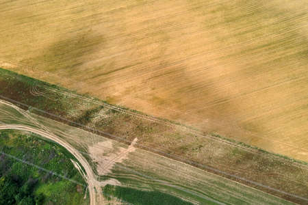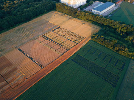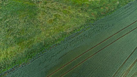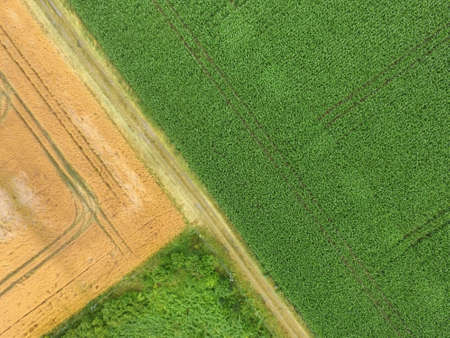 Rectangles and triangles, made by drone. Abstract aerial photograph of fields and weeds