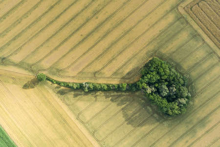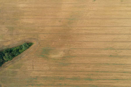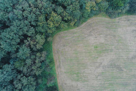 Aerial photograph of an arable land with fresh green at the edge of a forest with dense trees, much free area, with a lot of copy space