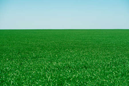 Green spring field in the rays of sunlight. Against a cloudless blue sky.