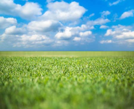 Green grass field and blue sky with white clouds. Nature background.