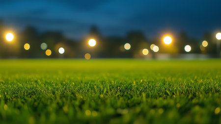 Evening lights illuminate a vibrant green field under the night sky in a tranquil sports area