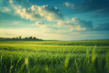 Green grass field is meeting the blue sky on a sunny day, creating a beautiful and serene landscape perfect for backgrounds and nature themed projects