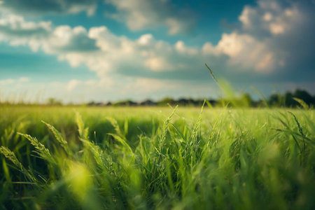 A close-up shot features lush green grass dominating the frame, with individual blades textured and detailed. Above, a deep blue sky provides a contrasting backdrop. The scene evokes a sense of natural beauty. Suitable for a range of commercial applications, including editorial and marketing material.