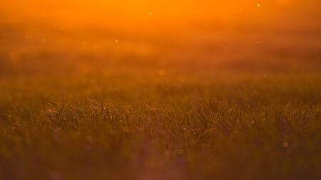 Sunset or sunrise in the field with green grass. Natural background.