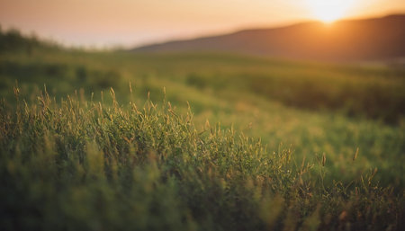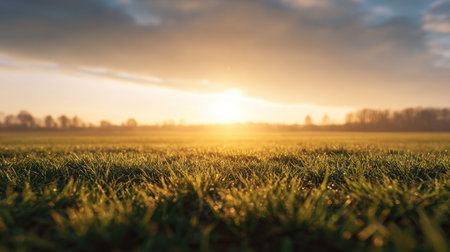 A close-up view of dewy green grass captures the essence of morning serenity with a soft sunrise glow illuminating the peaceful outdoor landscape.
