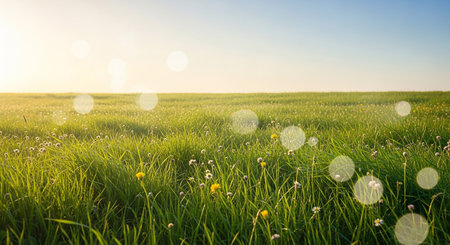 Sunset or sunrise over a green field with grass and flowers, natural background