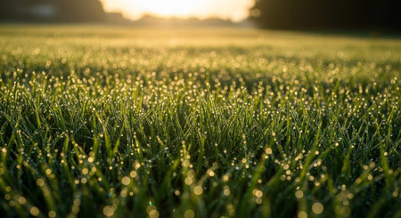 Lush green grass blades are covered in sparkling dew drops, illuminated by warm golden sunlight, creating a soft,...