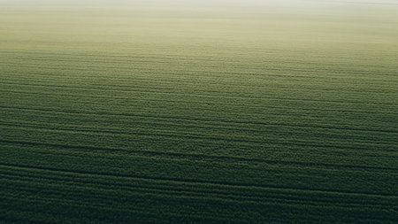 Agricultural showing an abstract aerial view of a vast agricultural field with perfectly straight, parallel rows creating a textured, striped pattern of green and...