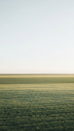 A serene green field with distinct horizontal rows stretches towards a pale, clear sky, creating a minimalist and tranquil agricultural landscape.