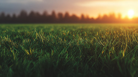This image features a close-up view of vibrant green grass, bathed in soft evening light, creating a serene outdoor atmosphere with distant trees. Perfect for nature themes.