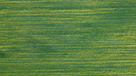 green country field of rye with row lines, top view, aerial photo. summer background