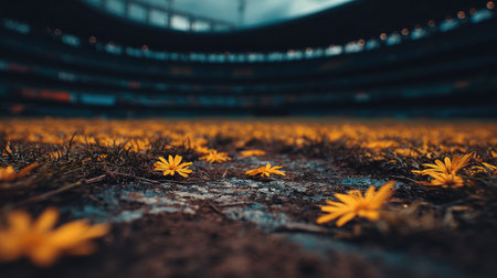 This image showcases a close-up of yellow flowers set against a dark, earthy foreground, with a blurred stadium in the background. The scene features natural lighting and a shallow depth of field, emphasizing the texture of the petals. The image may be suitable for advertising, editorial, or design projects.