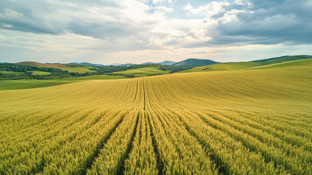 Illuminating showing expansive rolling agricultural fields of golden wheat crops under a dramatic cloudy sky with soft sunlight casting shadows across the...