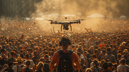 Experience the energy of a live music festival under a vibrant sunset. A massive crowd cheers as their favorite band performs on stage. Golden hour vibes!