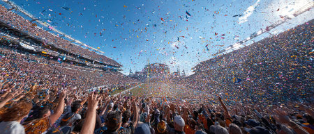 A wide-angle view captures a multitude of small, brightly colored paper confetti pieces scattered across a clear, azure sky. Below, a large gathering of individuals with arms and hands raised in excitement, participating in a joyous outdoor event. The scene evokes feelings of festivity, success, and communal happiness.