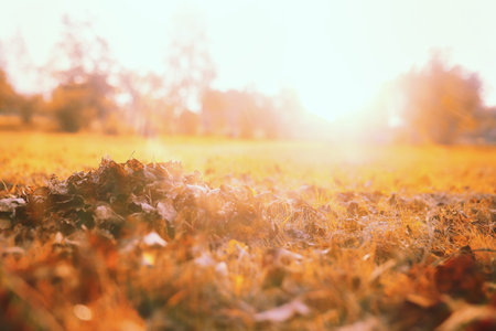 Yellow, orange and red september autumn leaves on ground in beautiful fall park. Fallen golden autumn leaves on green grass in sunny morning light yard, toned photo. October landscape background