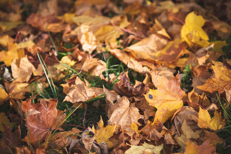 Colorful autumn leaves on grass. Autumn background, toned and blurred