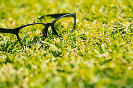 Peaceful image of glasses resting in green grass with open blue sky, blending vision, nature, and calm atmosphere.