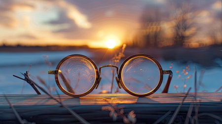 Glasses on the seashore image capturing the essence of clear vision, transparent perspective, and the beauty of sunrise and sunset