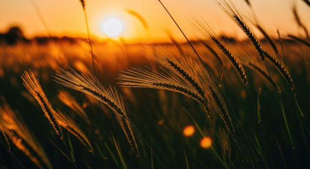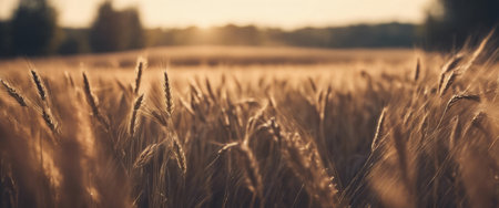 A view of a golden wheat field bathed in the warm glow of a sunset. The sun is low on the horizon, casting long shadows and illuminating the ripe wheat stalks with an amber light. The soft focus and bokeh effect create a serene and peaceful atmosphere, highlighting the beauty of the natural landscape. evokes feelings of abundance, tranquility, and the essence of rural life during harvest season.