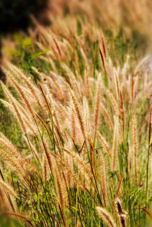 Sunlight on Grass flower flowing in hard wind in an outdoor open field.