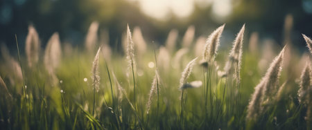 Summer sunny meadow. In the clearing there is a lush green grass with tall fluffy spikelets, permeated with sunlight.