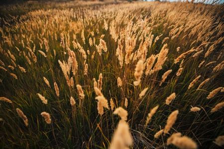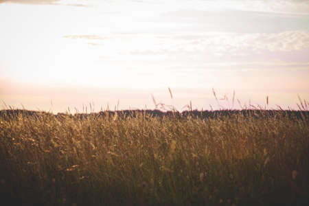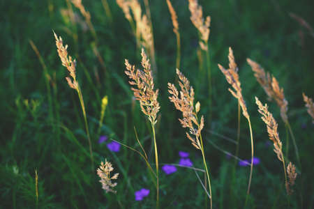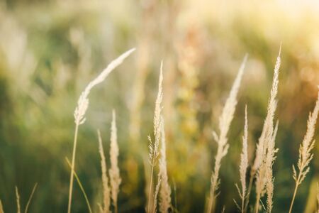 Field with wild grasses at sunset. Selective focus. Beautiful summer landscape, rural nature.
