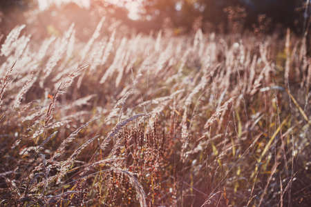 Natural beautiful background. Dry Golden grass covered with frost in the sun at sunset in autumn. Close up. Sunset on the background of the autumn field.