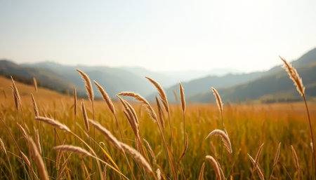 Tall golden grasses dance in the breeze under a clear blue sky during the warm afternoon. The sun shines brightly, illuminating the serene landscape in a peaceful setting.