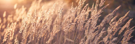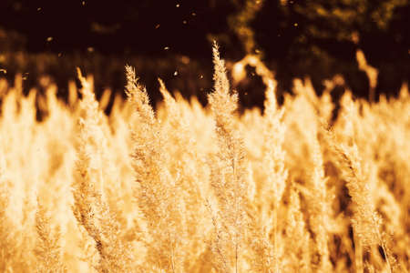 Selective soft focus of dry grass, stems blowing in the wind at golden sunset light. Nature, summer, grass concept.