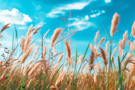 Generative AI : Dry grass flowers blowing in the wind red reed sway in the wind with sky background reed field in autumn