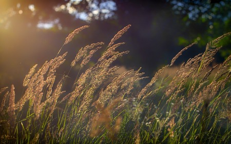 A close-up shot of tall grass stalks with feathery seed heads bathed in the warm light of a summer afternoon. The background is softly blurred, creating a dreamy, ethereal effect.