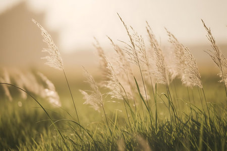 This image features tall grasses swaying gently in the breeze, bathed in soft sunlight during sunset, creating a tranquil atmosphere perfect for nature lovers.