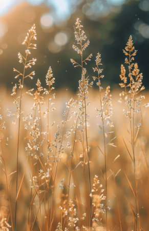 Tall green grass and wildflowers in a sunlit meadow are bathed in warm golden hour light, creating a serene natural...