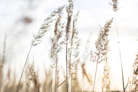 Soft focus of beach dry grass, reeds, stalks blowing in the wind at golden sunset light