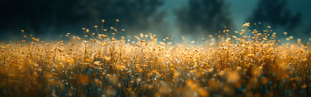 Wild grasses in summer meadow. Grasslands in evening countryside. Floral wallpaper. Grass and herbs close up in evening sunshine, atmospheric image