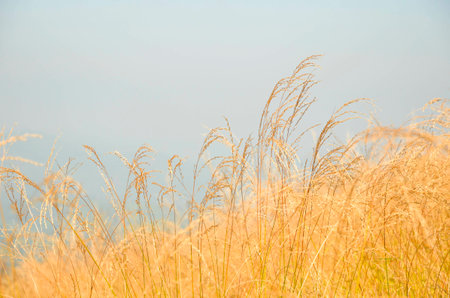 grass flower wind resist on gold sunset or sunrise and nature on meadow field for wake up in morning with warm sunlight for vacation holiday relax on countryside travel or home with space