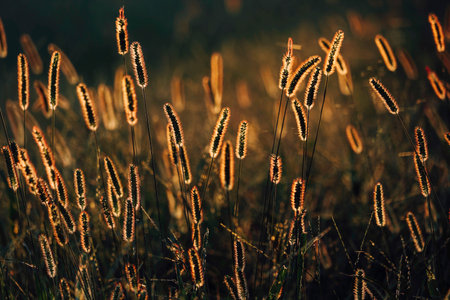 Fluffy bushes Timothy grass in the early spring morning under the bright and gentle sunrays. Selective focus macro shot with shallow DOF