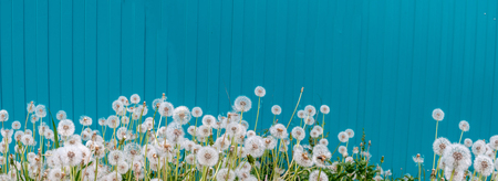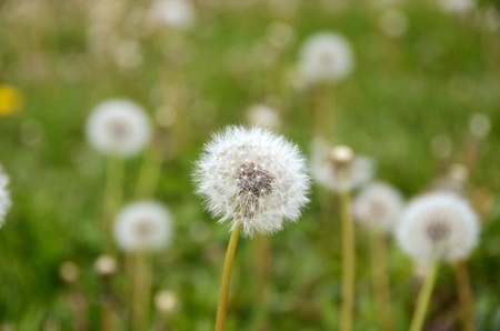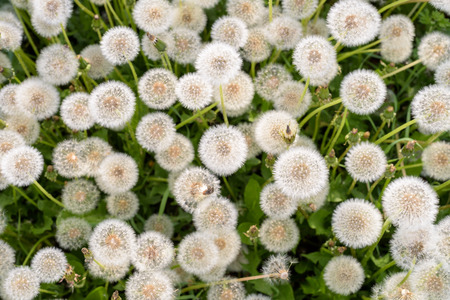 Countless dandelion seeds heads waiting to disperse their weed seeds into nearby gardens. A pest for many gardeners.