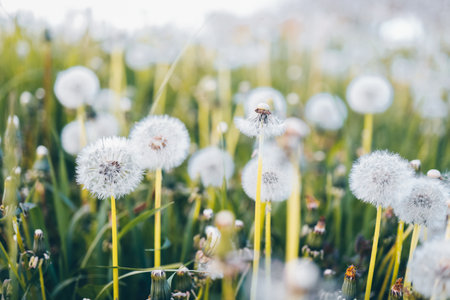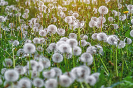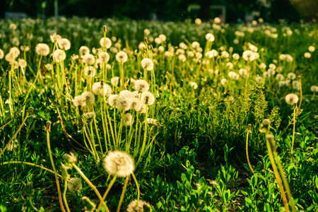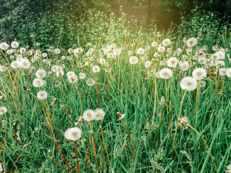 Field meadow full of white fluffy pretty dandelions and green grass. Home garden plant bad weed. Natural floral background with sun flare leak light.