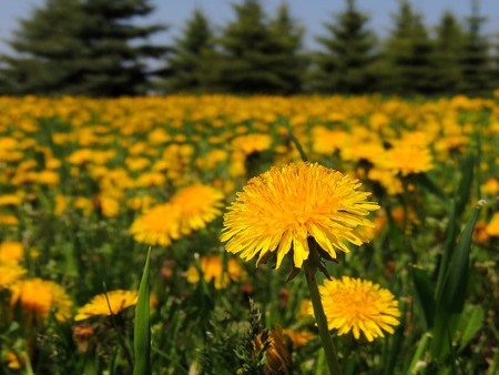 Macro shot of bright yellow dandelions (Lion's tooth) flowering in the big field of flowers with green grass and yellow dandelions with horizon and blue sky in background