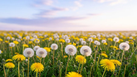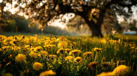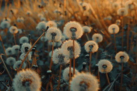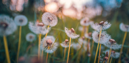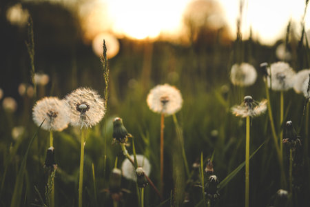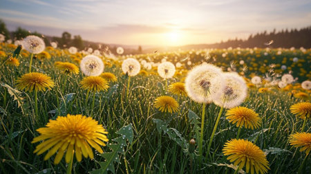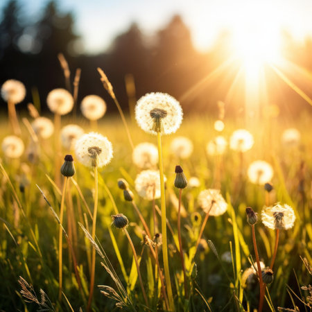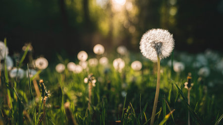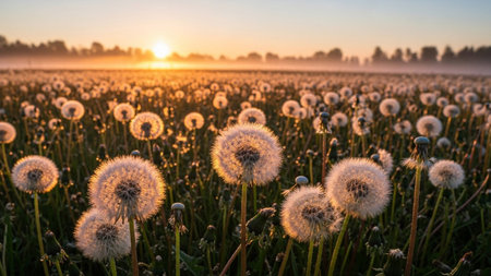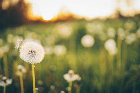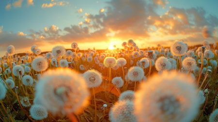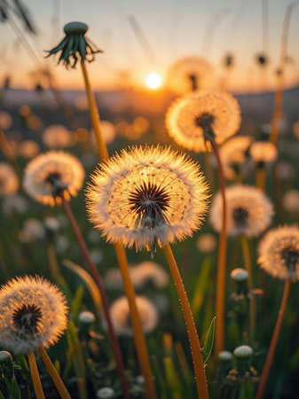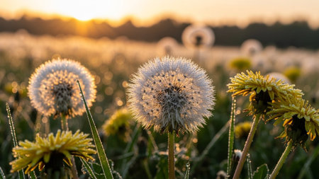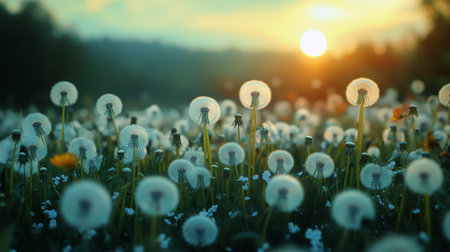 Stunning sunset over dandelion field closeup blurred bokeh foliage and lush background golden light creating a dreamy peaceful nature scene perfect for summer landscape photography