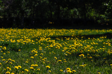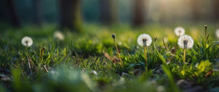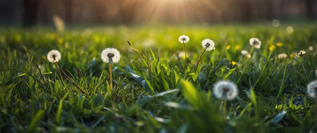 spring background panorama of yellow dandelions, a meadow with spring flowers, the sun's rays make their way through the trees