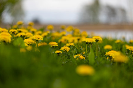 Beautiful yellow dandellion flowers blooming in the fresh grass. Natural spring scenery in Latvia, Europe.