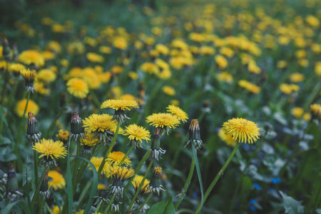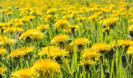 Macro shot of brightly yellow dandelion flowers in the green meadow in countryside in early summer around summer solstice. Bees are seeking nectar in yellow blooms and enjoying sun and warm weather