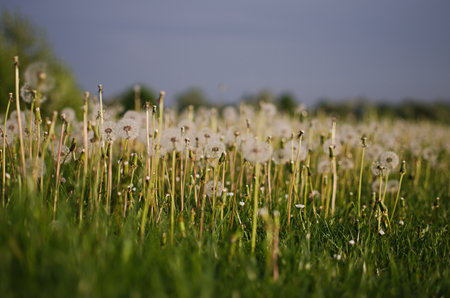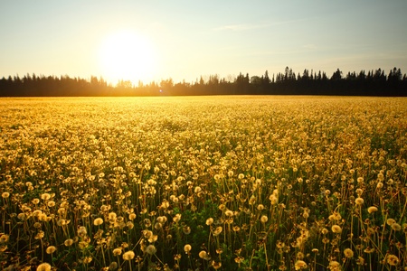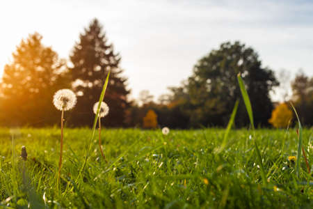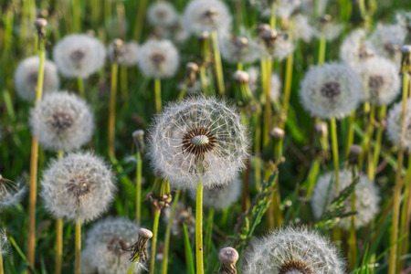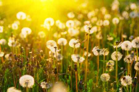 Dandelions on a sunny evening in the summer filed backlit in the rays of sunlight