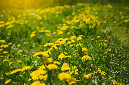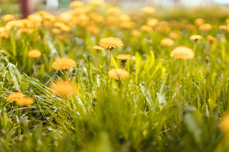 Beautiful flowers of yellow dandelions in nature in warm summer or spring on meadow in sunlight, macro.