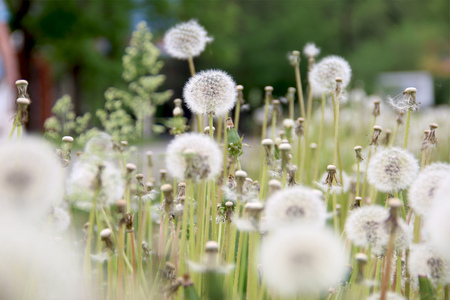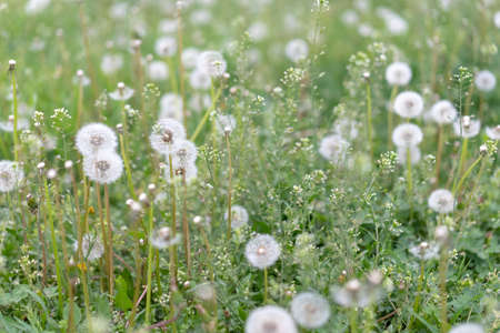 Field of white fluffy dandelions in June. Horizontal frame, close-up.