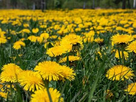 Bright dandelions in meadow at springtime. Blooming yellow dandelion flowers (Taraxacum officinale).