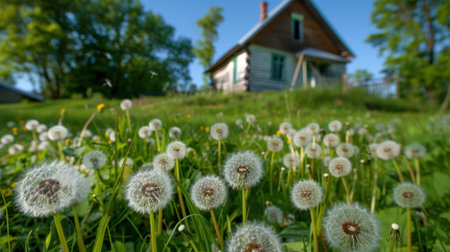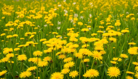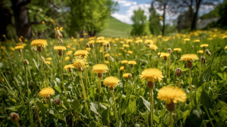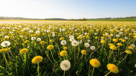 The beauty of a vibrant field of yellow dandelions blooming amidst green grass on a sunny summer day. Nature's beauty, seasonal change, and the fleeting nature of life.